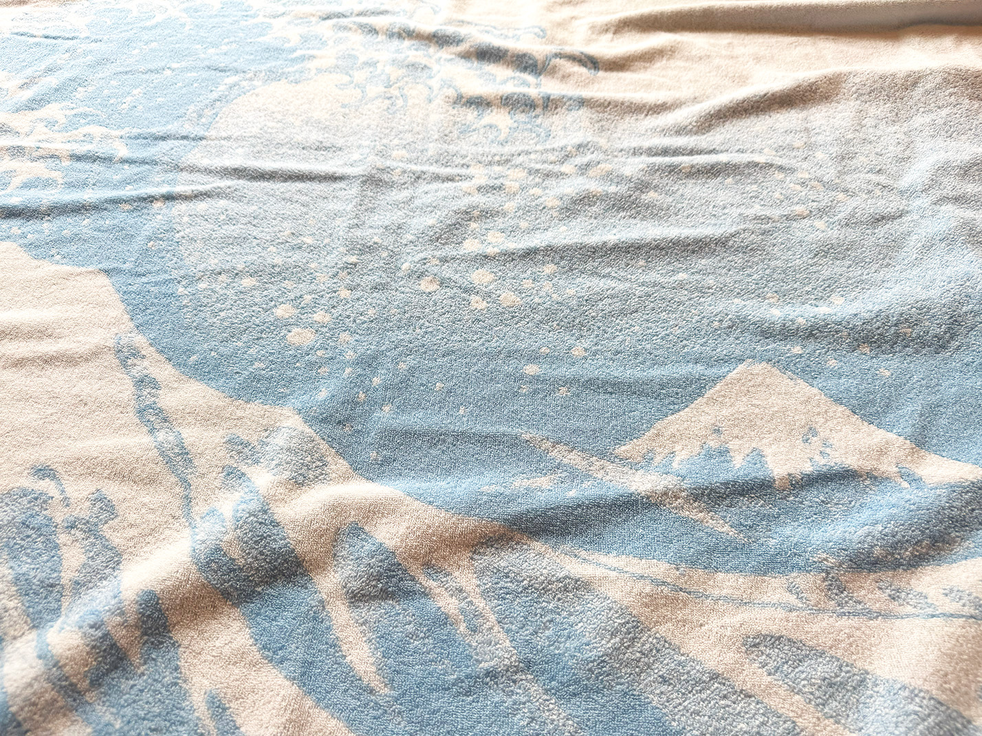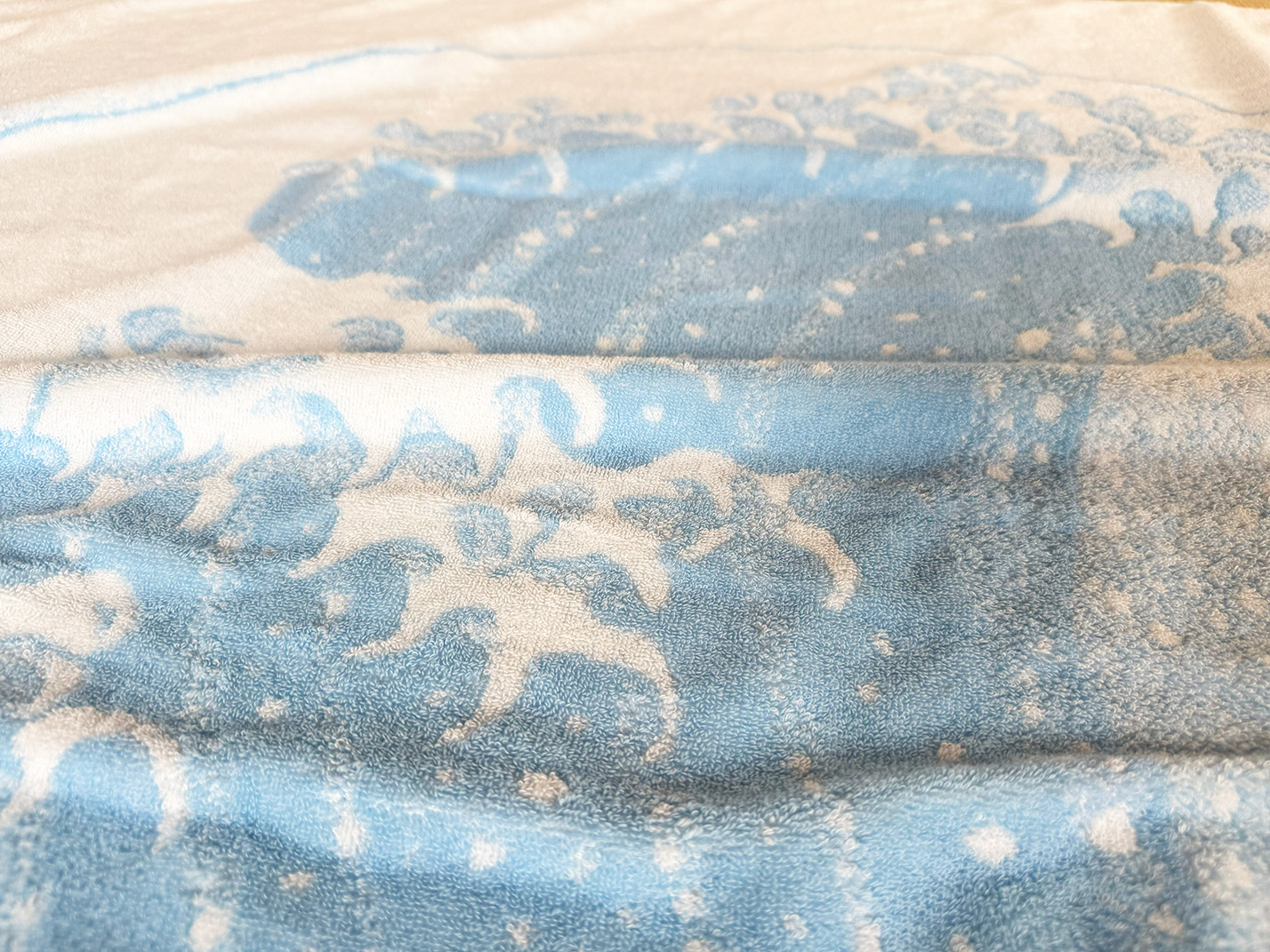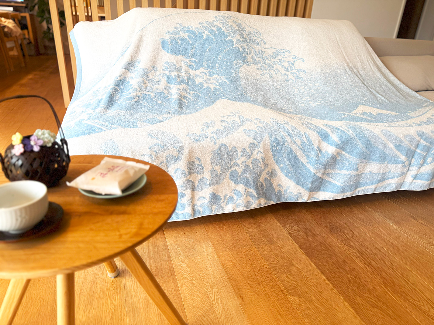 目の前に押し寄せる巨大な波、波頭に舞う白い飛沫――葛飾北斎の浮世絵「神奈川沖浪裏」が、今治製の柔らかくふんわりしたタオルで目の前に蘇ります。
