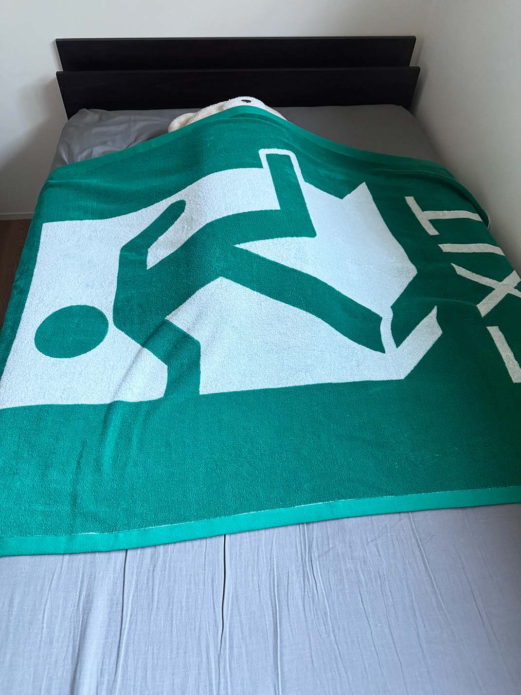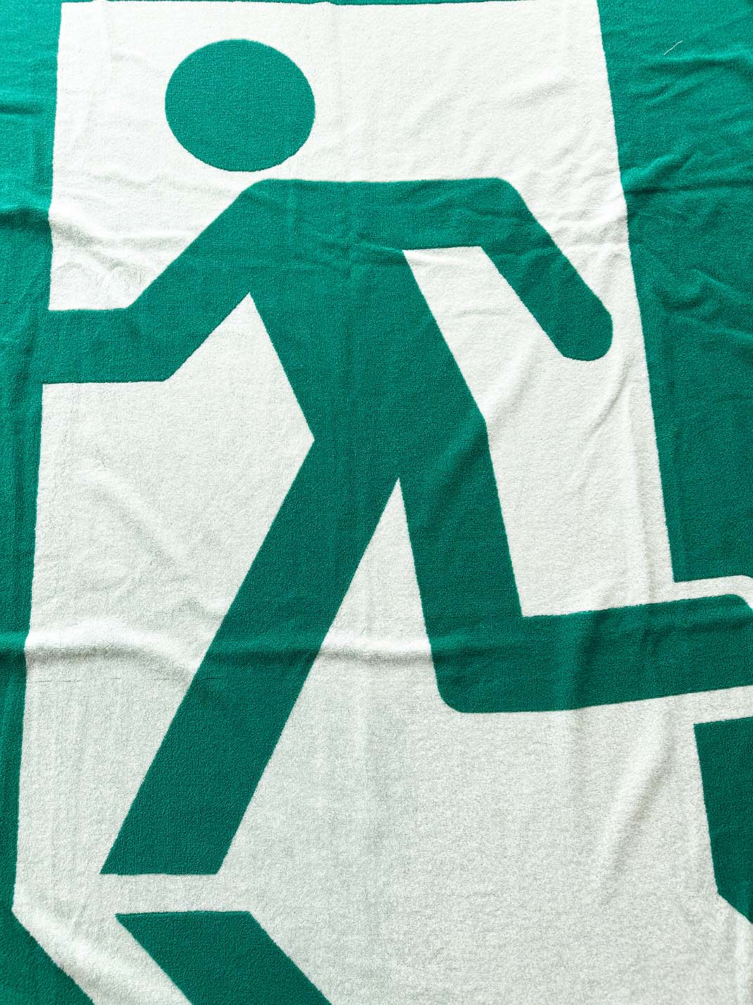 非常口のマーク(ピクトグラム)を、ジャカード織りのミニタオルケットとして織り上げました。