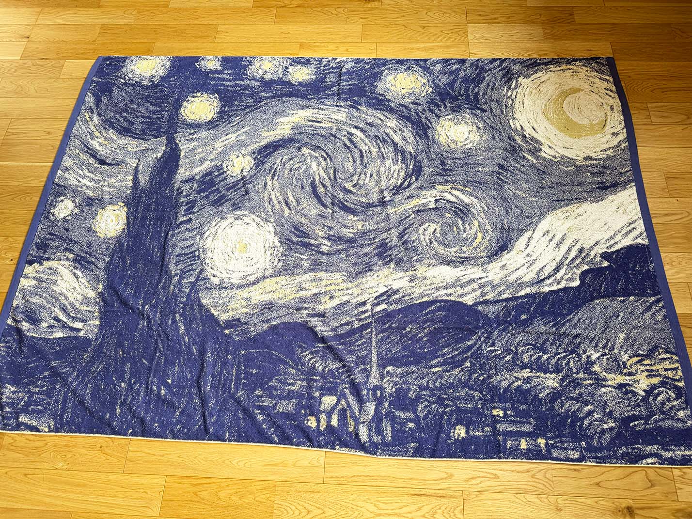 ゴッホの「星月夜」のデザインを、ジャカード織りのタオルケットとして織り上げました。